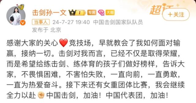 七月二十七日,巴黎奥运会击剑女子重剑个人赛,上届奥运冠军孙一文13-14不敌日本选手,无缘十六强。