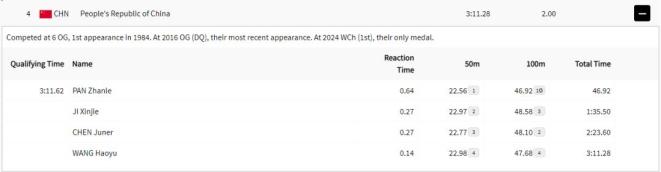 比赛中,第一棒出发的潘展乐出发时间出色,为0.64秒。从那以后,他很快就占据了领先地位。50米时,以22秒56的成绩排名第一,并以46秒92的成绩触壁完成交接。