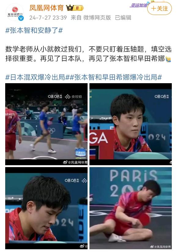 北京时间27日晚,在巴黎奥运会乒乓球混双1/8决赛中,赛会二号种子张本智和/早田希娜与朝鲜组合李正植/金琴英进行了比赛,最终日本组合1。:4爆冷不敌对手,无缘混双八强。
