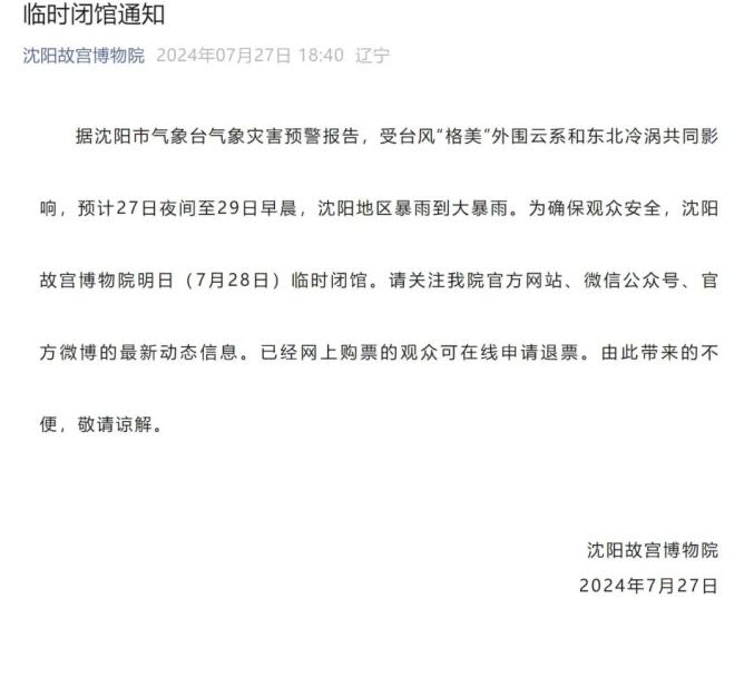 据沈阳市气象台气象灾害预警报告,由于台风“格美”外围云系统和东北冷涡的共同影响,预计沈阳地区将于27日晚至29日上午暴雨至暴雨。为了保证观众的安全,沈阳故宫博物院明天(7月28日)将暂时关闭。请关注我院官网、微信微信官方账号、官方微博的最新动态信息。已经在网上购票的观众可以在网上申请退款。请理解这带来的不便。