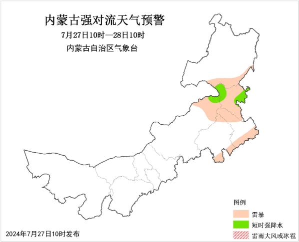 内蒙古自治区气象台发布强对流蓝色预警:预计7月27日10:00至7月28日10:00,锡林郭勒盟东北部、赤峰市南部和东北部、通辽市西北部和南部、兴安盟、呼伦贝尔市南部有雷暴。