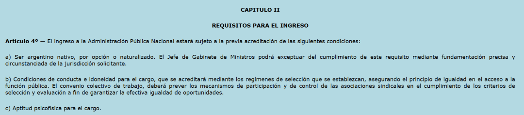 根据阿根廷现行第25164号《公共就业监管框架法》第2章第4条,进入国家公共行政机关的申请人(或候选人)必须满足以下三个条件:必须出生在阿根廷或者已经入籍成为阿根廷公民,但内阁首席部长可以根据申请岗位的具体情况免除这一要求;满足岗位招聘的需要;具备申请岗位所需的身心条件,有关条款对申请人的年龄、工作经验等方面没有提出要求。