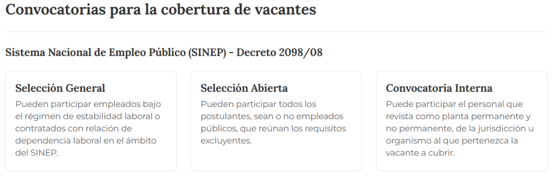 官方网站阿根廷政府(argentina.gob.ar)数据显示,进入国家公共行政机关的途径主要分为三类:一般选拔(Selección General)、公开选拔(Selección Abierta)以及内招(Convocatoria Interna)。