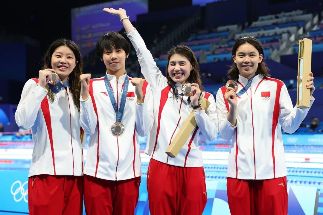 女子4×中国队在100米自由泳接力决赛中获得铜牌,打破了亚洲纪录,包括杨浚邈、程玉洁、张雨霏和吴卿风。