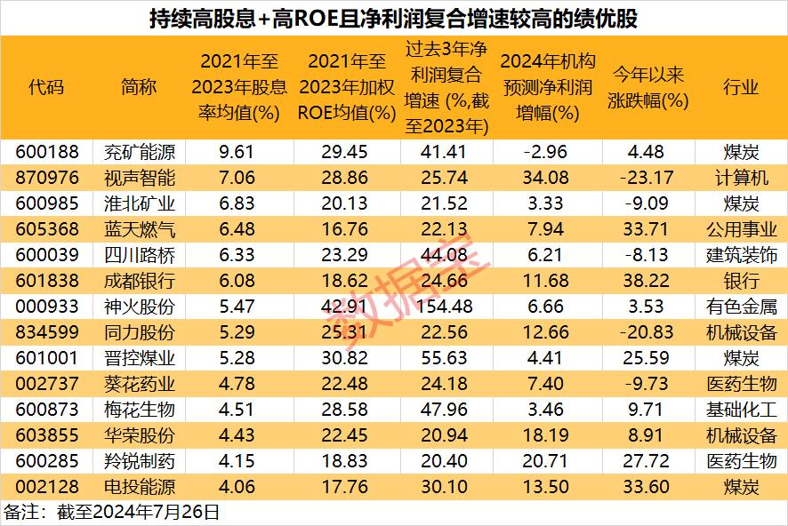 据统计,2021-2023年股息率持续超过3%,截至2023年,净利润复合增长率超过20%,2021-2023年加权ROE持续超过15%(去掉2024年上半年业绩“预减”的股票)只有14只股票。