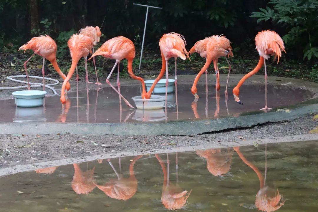 下一站是花园里最凉爽的火烈鸟区。自从安排了用于降温的喷雾装置后,火烈鸟展区不时呈现出“仙气飘飘,云雾缭绕”的状态。橙色的鸟生活在这种情况下,更像是一个拍照的芭蕾舞演员,吸引了大量的观众静静地欣赏。