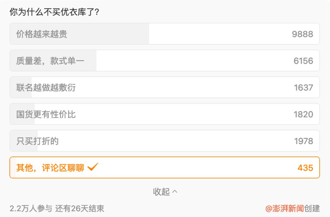 今年7月20日,ThePaper在网上发布了一项调查,“你为什么不买优衣库?截至7月24日下午5点,已有2.2万人参与。