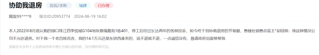 今年6月,有网友表示,2022年8月底,他们认购了禄口珠江四季悦城G104地块鼎瑞嘉园1栋401。停工后,经过两年的各种投诉,他们终于到了讨论退房的节骨眼。售楼处销售总监王某表示,在这种情况下,公司不能退房。他的14.1万元是七拼八凑的,恳求政府帮忙。