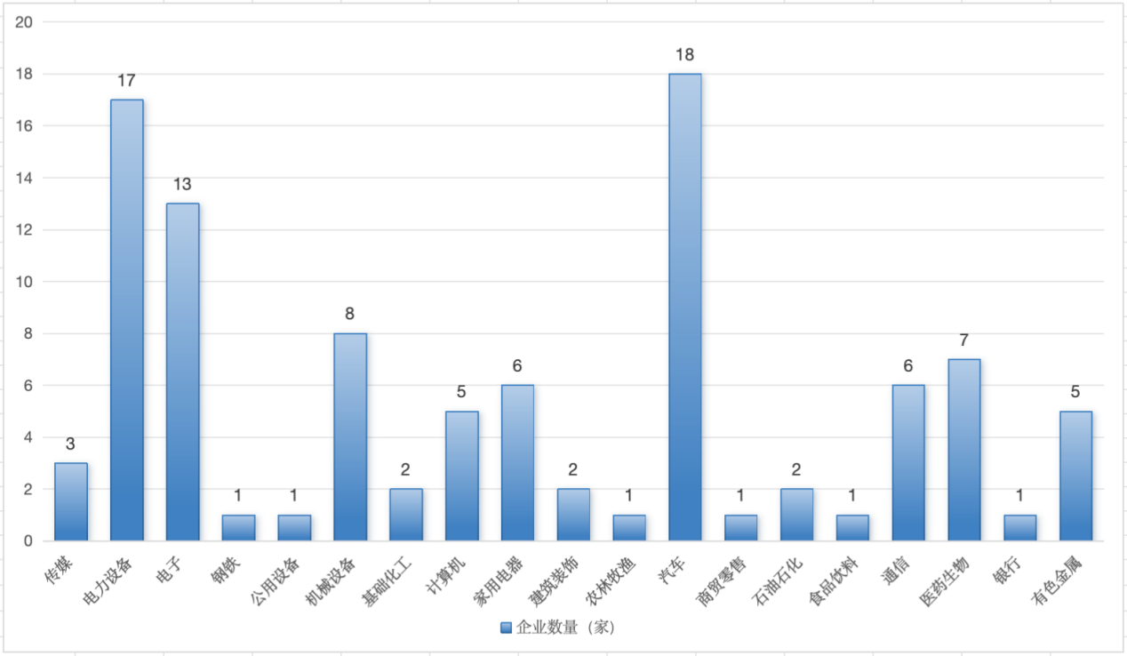 除区域外,海上上市公司的行业也集中在一定程度上,加工制造业更愿意走向国际市场。根据申万一级行业的数据,汽车、电气设备、电子等领域的海外企业数量遥遥领先。其中,汽车公司18家,电气设备公司17家,电子公司13家。