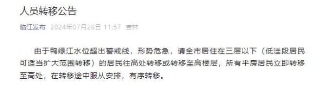 据“临江发布”微信微信官方账号消息,7月28日,吉林市临江市人民政府防汛抗旱指挥部发布人员转移公告:由于鸭绿江水位超过警戒线,情况危急,要求全市居住在三层以下的居民(低洼居民可适当扩大范围转移)转移到高层,所有平房居民立即转移到高层,在转移过程中服从安排,有序转移。