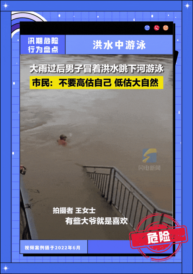 正确做法:警惕汛期涉水活动,防止溺水事故,避免在洪水中游泳,避免在未知环境或有警告提醒的水域游泳,如河流水库。