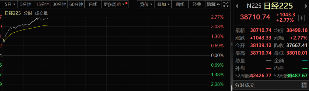 今天上午,上周大幅下跌的亚太股市几乎全线飙升,日经225指数一度上涨2.7%以上。韩国股市和澳大利亚股市也全线上涨,A50和台湾省股指也表现不错。截至上午9点左右,MSCI亚太指数上涨至1%。
