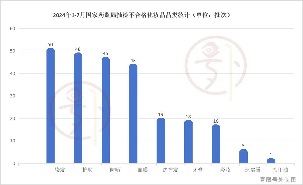 2023年,国家美国食品药品监督管理局检测出601批次不合格产品,其中177批次染发产品排名第一,占29.5%。从今年1-7月的数据可以看出,染发产品仍然是抽检不合格的高发区。