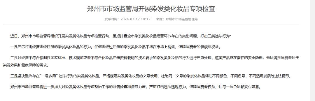 郑州市市场监督管理局在公告中表示:坚决整治存在“一号多用” 染发化妆品的违法行为。严格规范染发化妆品的文号使用,避免同一文号的染发化妆品标注不同颜色、不同颜色、不同适用头发等违法情况。