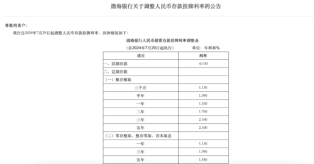 渤海银行的一年期、两年期、三年期和五年期定期存款利率分别降至1.55%、1.70%、2.10%、2.10%。