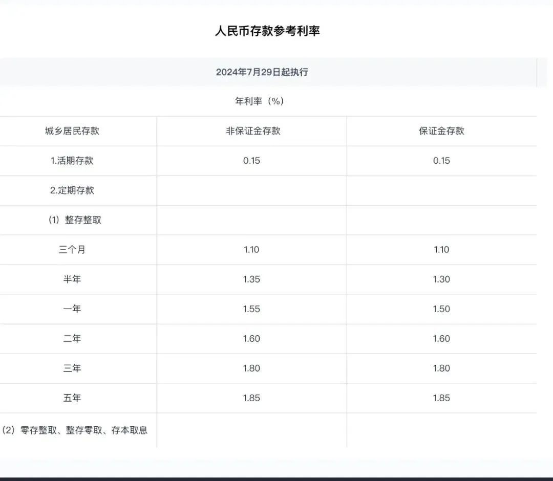 一年期、两年期、三年期、五年期人民币定期存款利率分别降至1.55%、1.60%、1.80%、1.85%。