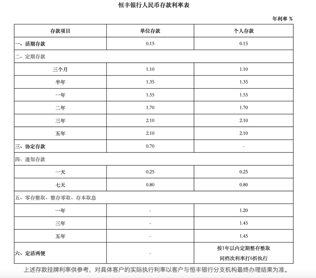 恒丰银行一年期、两年期、三年期和五年期人民币定期存款利率分别降至1.55%、1.70%、2.10%、2.10%。