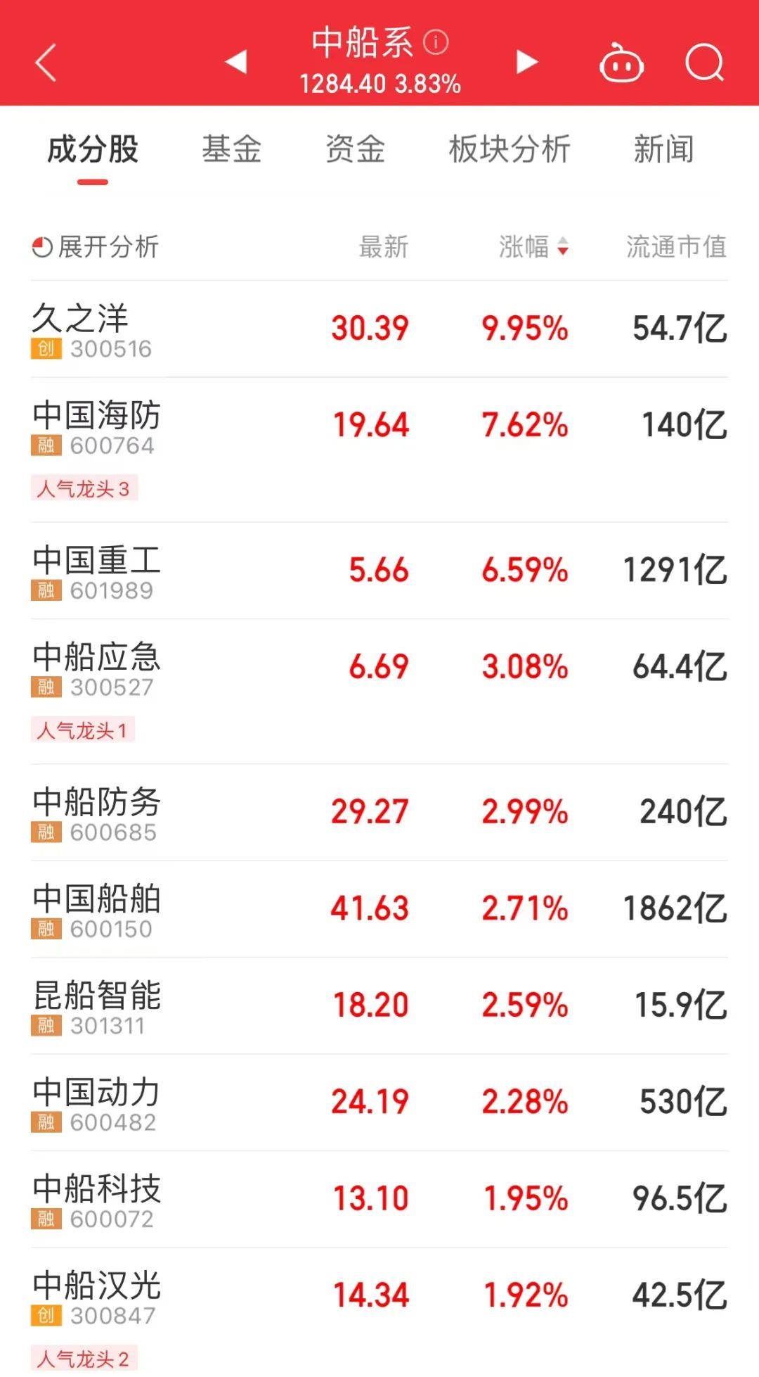 a股船舶板块震荡走高,“中船系”集体走高。中科海讯20cm涨停,中国海防涨超7%,中国重工业、中船防务、中国船舶等待多芯涨幅居前。