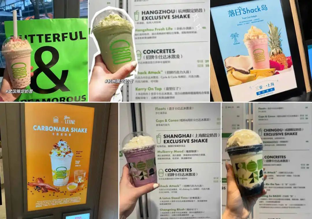 还有来自纽约的汉堡品牌Shake Shack在中国推出了城市限量奶昔,如北京限量的冰糖巷奶昔、上海限量的魔都魅紫奶昔、海南限量的日落shack岛奶昔、香港限量的卡邦尼奶昔。 福州限制的威士忌奶昔 开心果奶昔等等。