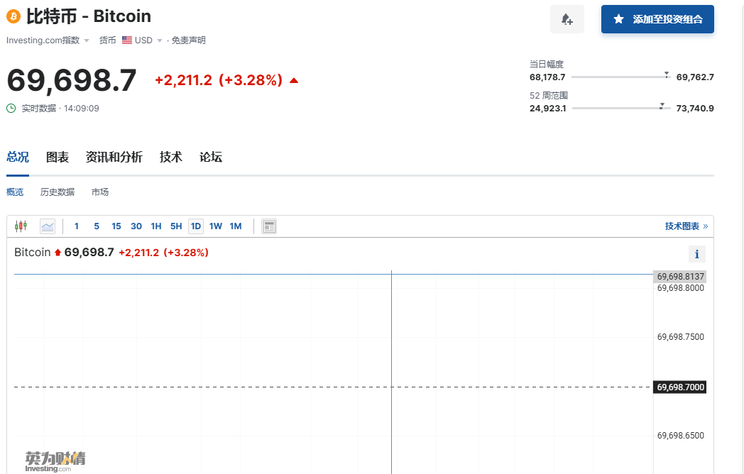BTC一度上涨超过3%,截至发稿时,已报69698美元。以太币、Solana和狗币等较小的数字货币也在上涨。