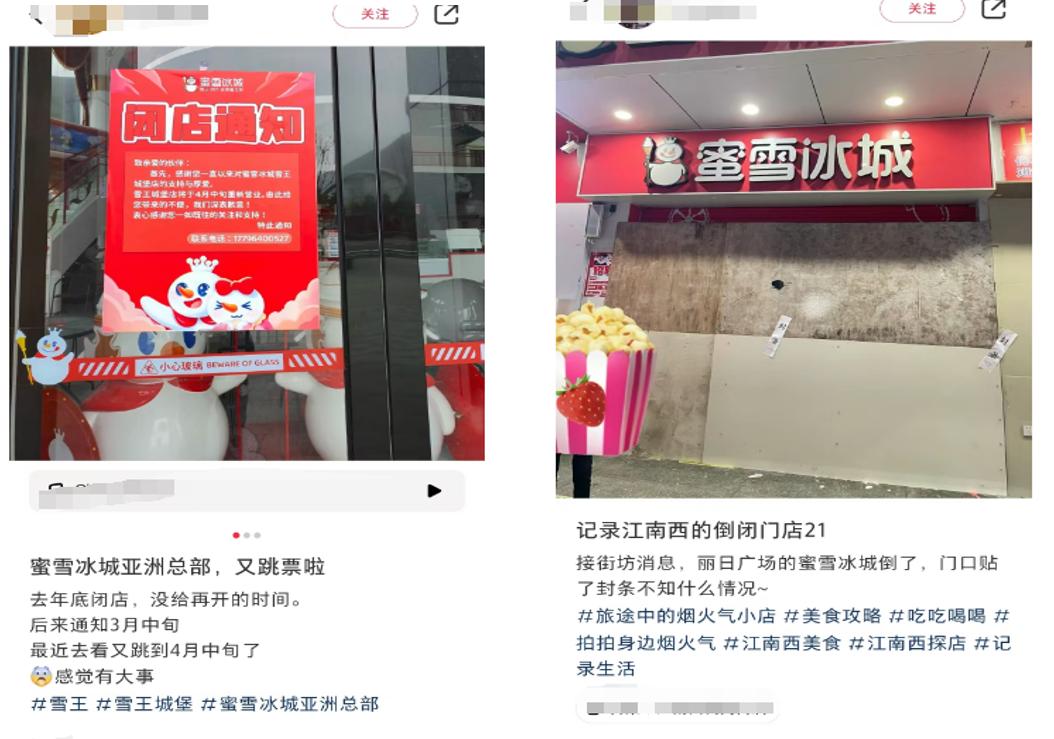 网络平台,如抖音、小红书等,关于蜜雪冰城关店的帖子和视频也越来越多。"丽日广场的蜜雪冰城倒塌"、"蜜雪冰城倒闭了?想喝甜水找蜜雪冰城,周围两家都关门了,蜜雪冰城怎么了?"、“蜜雪冰城亚洲总部关门了!”甚至有报道称,蜜雪冰城的日本商店也倒闭了。