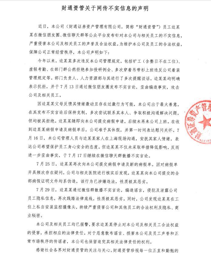 据财通资产管理部门介绍,7月25日,边某某再次向公司提交病假申请和新的病假清单。由于对病假清单发放频率存在疑问,公司及相关医院核实后发现,边某某向公司提交的所有病假证明文件均为伪造,涉嫌违法,特点极其恶劣。