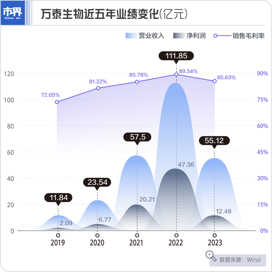 受此影响,2023年,万泰生物收入增长熄火,同比下降50.73%至55.1亿元,净利润同比下降74.37%至12.48亿元。