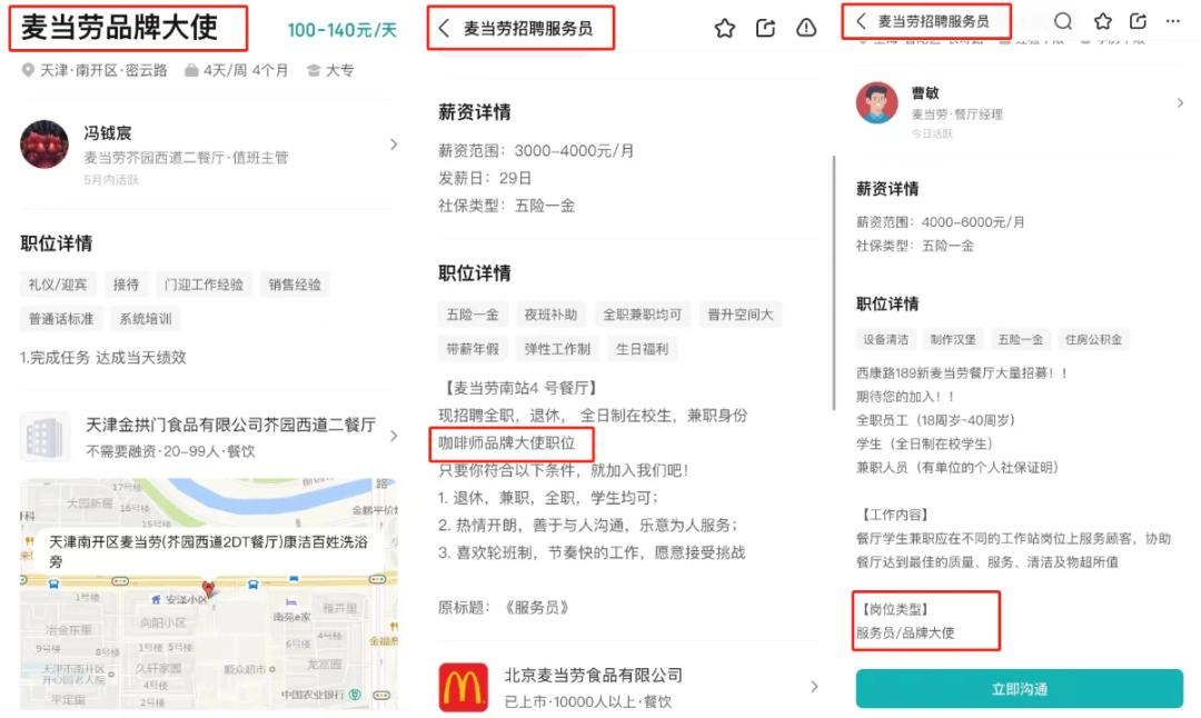 体现在招聘市场上,肯德基品牌大使和餐厅服务员不会有严格的职业堡垒。虽然可以在BOSS直接招聘中找到独立招聘“品牌大使”的门店,但在很多情况下,“品牌大使”也被列为“麦当劳服务员”进行统一招聘。