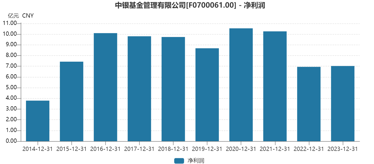 Wind数据显示,2023年中银基金净利润为7.02亿元,较2022年同期增长1.15%,且时间延长一看,凤凰网财经《投资观察》发现,中银基金整体业绩并未明显增长,公司净利润从2020年开始一路下滑,直至2023年才稳定下来。