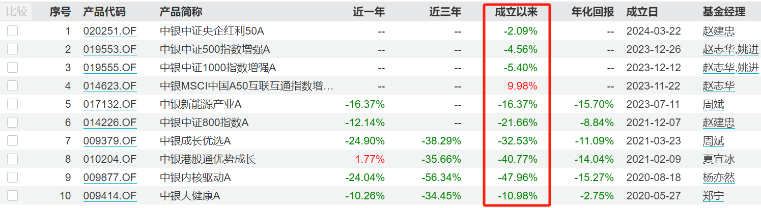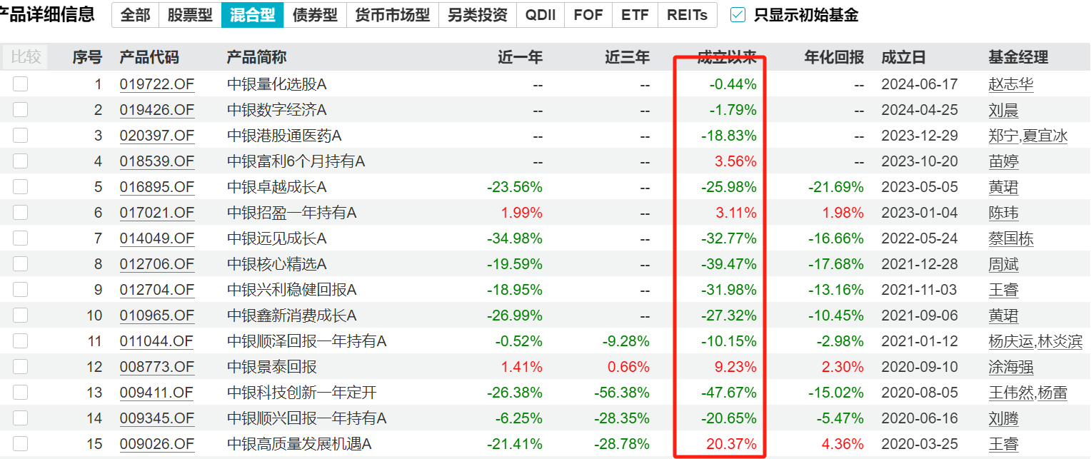 数量跟不上,“质量”也令人担忧。Wind数据显示,中银基金自2020年以来设立的几只股票基金中,只有一只盈利,另外两只亏损超过40%。混合基金稍微好一点,但是15只基金中,只有4只盈利。