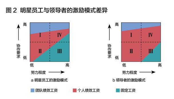 如图2a所示,当明星员工努力工作,组织需要他们发挥个人创造力时,他们应该使用以固定工资为基础的薪酬模式(如协议工资制度)来降低绩效工资对他们内在创新动机的约束(如图2a所示Ⅲ);如果组织需要他们促进团队发展,就应该采用以个人绩效工资为主体的薪酬模式,引导他们发挥示范作用,同时辅以团队绩效工资制度,如图2a象限所示,让他们承担更多的团队指导责任Ⅳ)。正如一项研究所揭示的,为了提高团队绩效,明星员工会主动把忠实的客户交给普通员工,然后自己挖掘新的客户来源。正如一项研究所揭示的,为了提高团队绩效,明星员工会主动把忠实的客户交给普通员工,然后自己挖掘新的客户来源。当然,如果明星员工不努力,他们会使用绩效工资制度(如图2a所示Ⅱ)。当合作要求高时,应采用团队和个人绩效工资混合制度(如图2a象限所示)Ⅰ)。