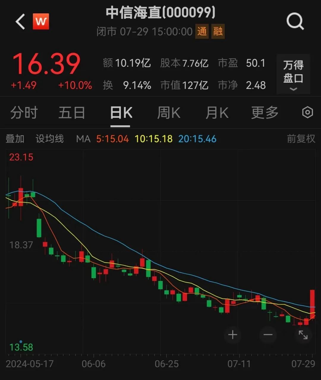 七月二十九日,中信海低开高走,临近午盘时封盘,收盘7.65万手。今年二月六日,这只股票一度创下阶段低点,随后开启了一轮大市场。得益于低空经济主题的持续发酵,中信海在4月29日的盘中创下了8年来的新高,从2月6日到4月29日,最大涨幅达到2倍以上。然而,不久之后,低空经济主题也出现了明显的降温。到目前为止,已经调整了近三个月。在今日涨停之前,该股收盘价较年内高点下跌近40%。