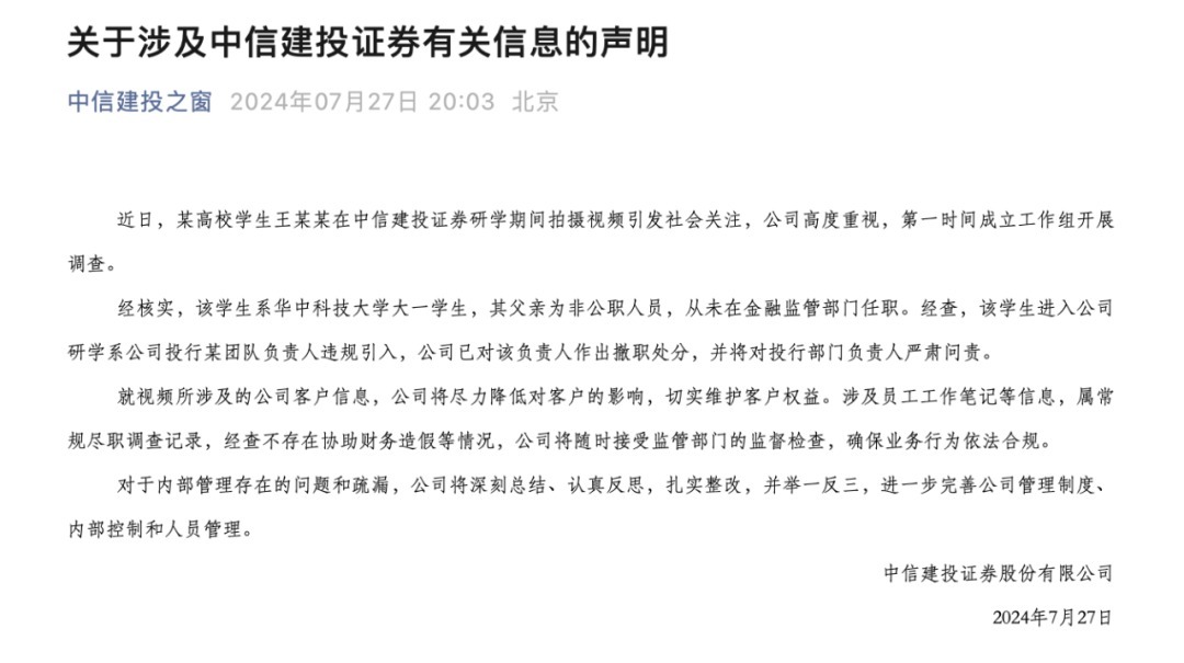 大学生在研究期间拍摄vlog引起争议,中信建投声明