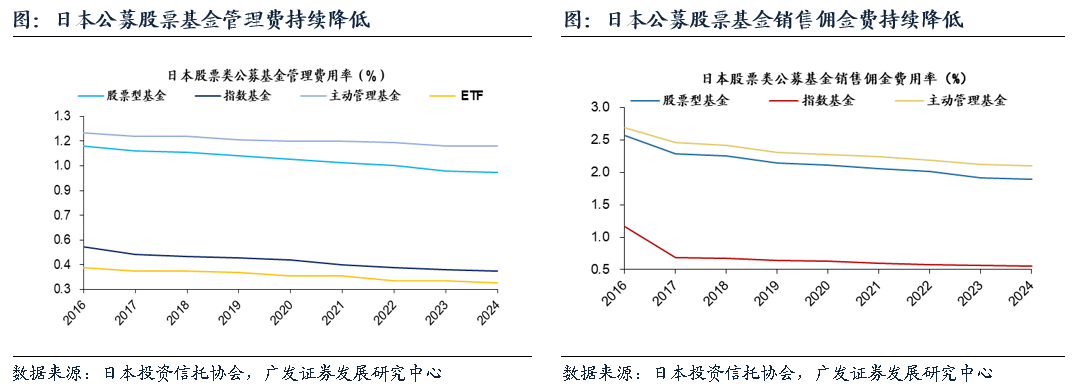投资需求萎缩,供给侧竞争加剧,降低成本可以有效提高商品对投资者的吸引力。近年来,日本公开发行的管理费率和销售费率整体稳步下降。主动型(股票基金)和被动型(ETF、自2016年以来,指数基金的管理费率和销售佣金费率都有不同程度的下降。