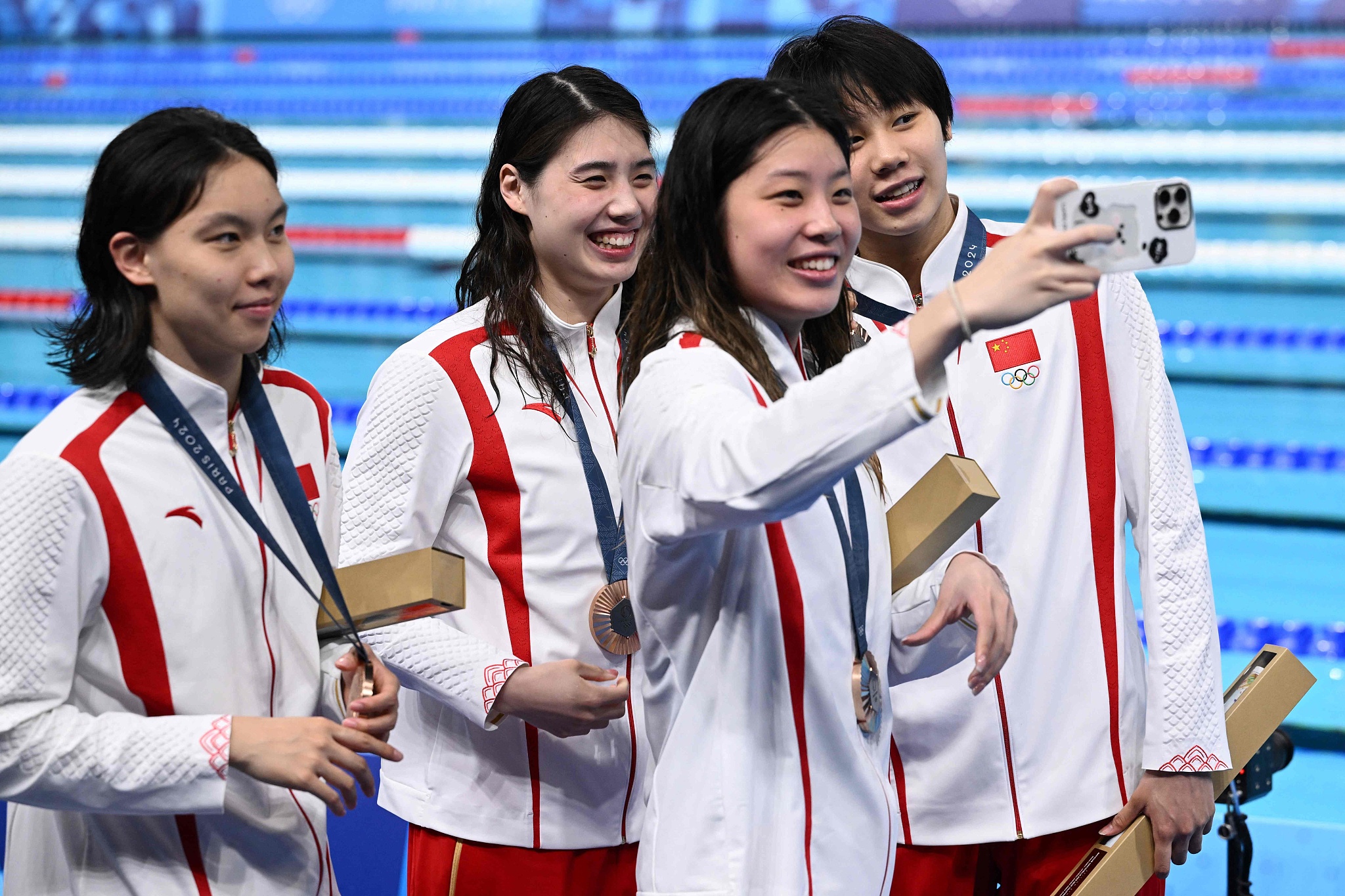 为中国队获得4X100米自由泳接力铜牌的张雨霏和同伴。