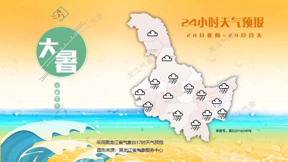 28日晚至29日白天:双鸭山阴雨,大兴安岭、黑河北部、齐齐哈尔西部、绥化阴天,其他地区阴天有阵雨或雷暴。