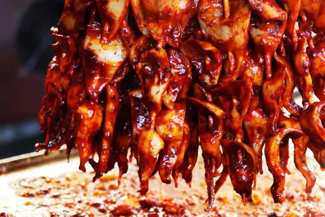用秘制酱包裹的鱿鱼在碳火上发出巨大的声音,金黄可口,油脂渗透,外焦内嫩,香味浓郁。咬一口,美味的鱿鱼汁在嘴里爆炸。