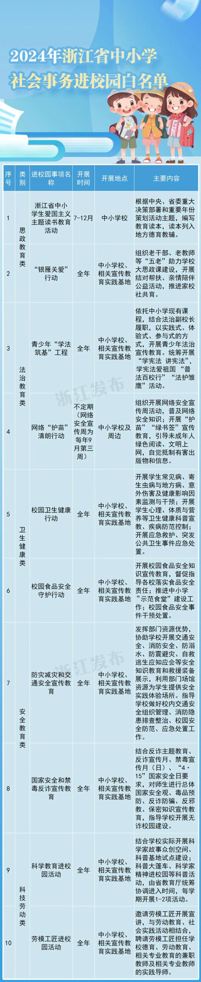 近日,中共浙江省委教育领导小组秘书组发布《关于印发2024年中小学社会事务进入校园白名单的通知》,批准确定2024年浙江省中小学社会事务进入校园白名单。明确2025年起,省级单位应当按照有关要求及时向省委教育领导小组秘书组申请进入校园,每年春季学期开学前公布社会事务进入校园白名单。