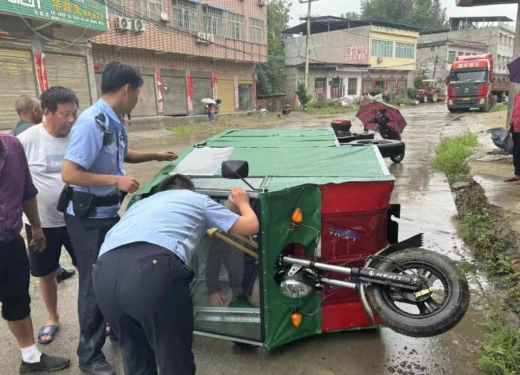 警方了解到,这位72岁的老人潘某,是驻马店市泌阳县人,独自在毛集镇租房。下午,潘老汉开着电动三轮车在街上购物。当他到达十字路口时,三轮车突然改变了方向,因为他避开了对面相向行驶的车辆。此外,路面雨水湿滑,导致三轮车向右翻倒。他被困在三轮车的驾驶室里,无法出来。幸运的是,路过的热心人帮忙报警求助,警察迅速赶到救出。