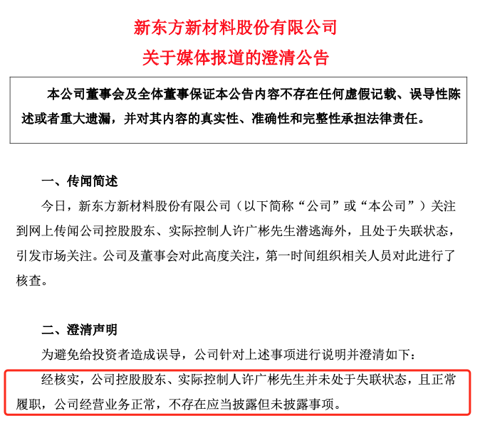 7月29日晚,东方材料(603110)披露了关于媒体报道的澄清公告:今天,公司注意到了上述谣言。经核实,公司控股股东和实际控制人许广彬没有失去联系,正常履行职责。公司经营正常,不会有应当披露但未披露的事项。