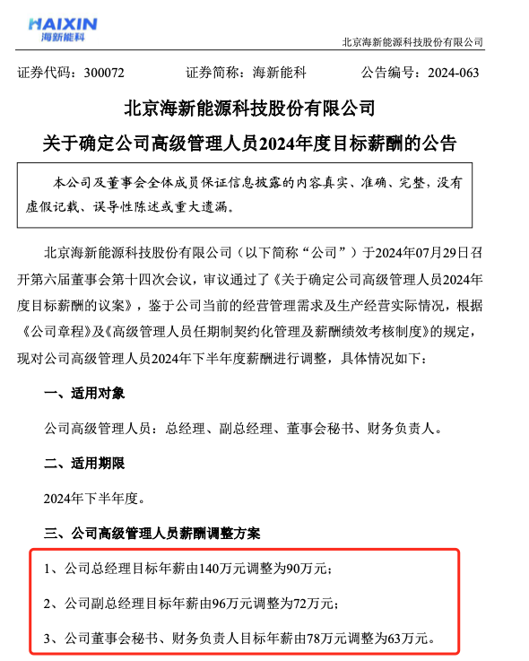 海新能科7月29日晚宣布,拟调整2024年下半年公司高级管理人员工资。本次调整的适用范围包括海新能科总经理、副总经理、董事会秘书、财务主管等高级管理人员。