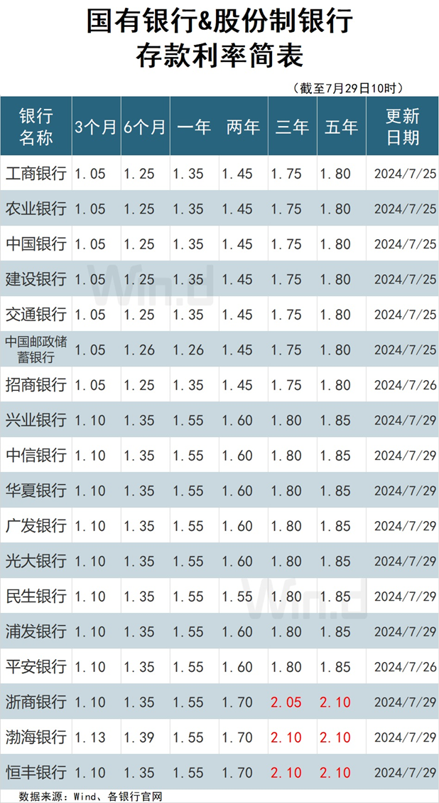 7月29日,中信银行、光大银行、兴业银行、浦东发展银行、民生银行、华夏银行、浙商银行、广发银行、渤海银行、恒丰银行调整人民币储蓄存款利率。此外,招商银行和平安银行于7月26日调整了利率。到目前为止,全国12家股份制银行已经完成了本轮存款利率的下调。