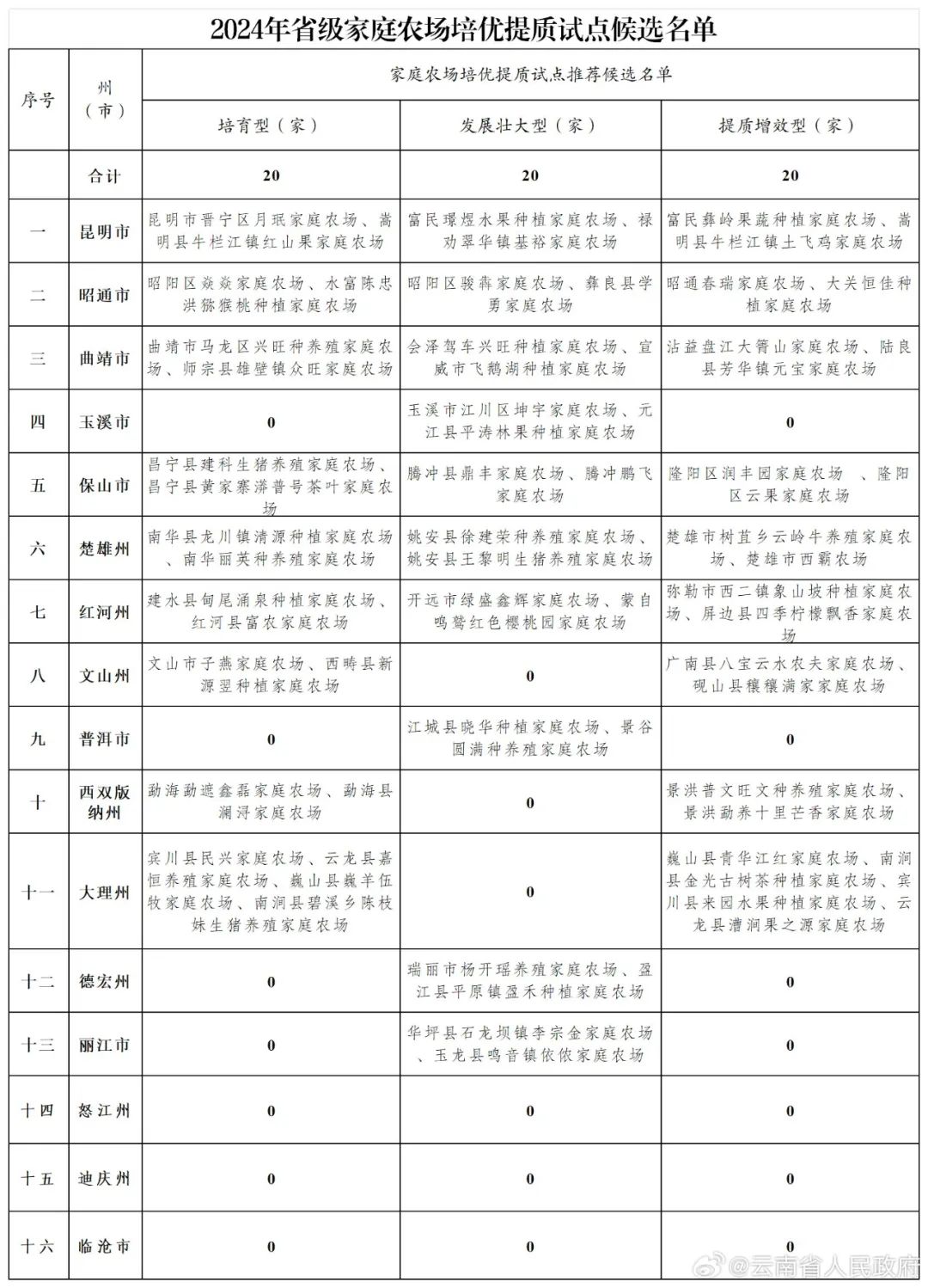经家庭农民自愿申请,州(市)农业农村部门逐级审批、公示、推荐,云南省农业农村厅核实等程序,省农业农村厅拟对昆明市晋宁区月桂家庭农场等60个家庭农场进行初步评定,为2024年省级家庭农场培优质试点候选人名单。公示时间为2024年8月2日。