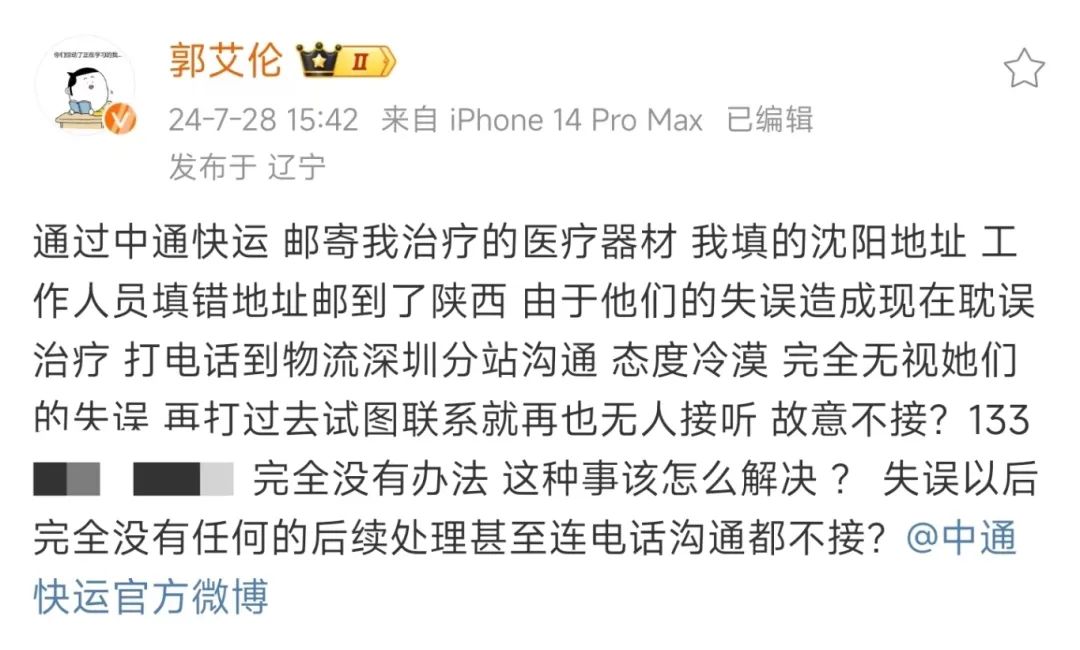 郭艾伦在个人账户中表示,由于工作人员写错地址的错误,中通快递治疗的医疗器械现在延误了治疗,物流方态度冷淡,没有接电话,也没有任何后续处理。