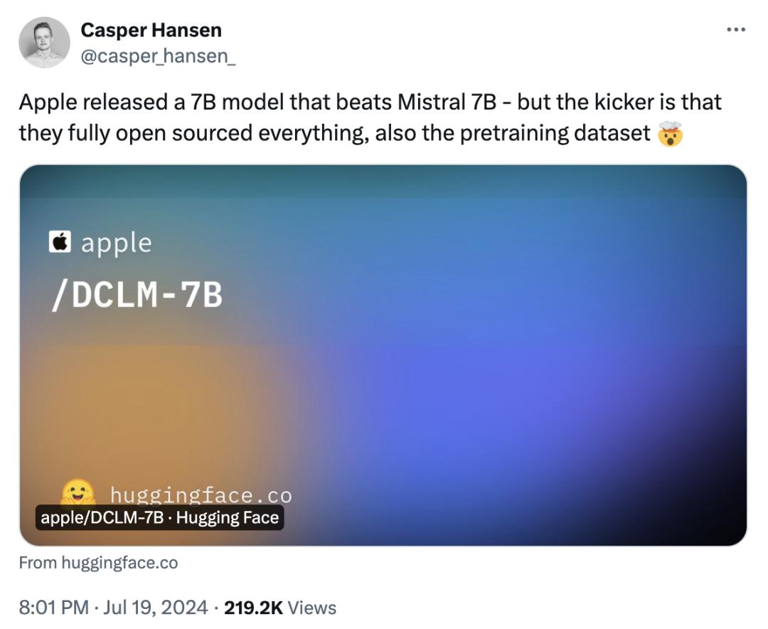 苹果也不甘示弱,发布了70亿参数的小模型。 DCLM-7B,并立即将其全部开源。