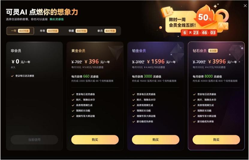 用户数量是产品商业化的土壤。基于此,可灵商业化的想象空间得到了进一步打开。目前,可灵AI已经推出了付费会员制度,分为黄金、铂金和裸钻。月卡价格分别为66元、266元和666元,相应生成约66个、300个或800个标准视频。