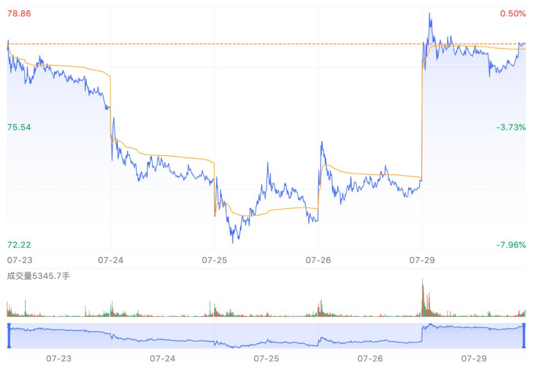 7月29日,开盘后,赛力斯股价一路上涨,最高达78.89元/股,涨幅超过6%,截至下午15点收盘,最终跌至77.96元/股,增长5.32%。。