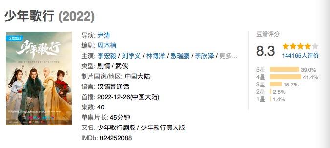 幸运的是,幸运的是,近年来,市场逐渐经过“男频” 顶流=烂剧”的泥潭。去年,成毅的《莲花楼》获得豆瓣8.5分;此前,《长安最长的一天》也让易烊千玺在演员的道路上开启了亮点。作为第二个男主角,刘宇宁的《天行健》也获得了豆瓣8.1分。
