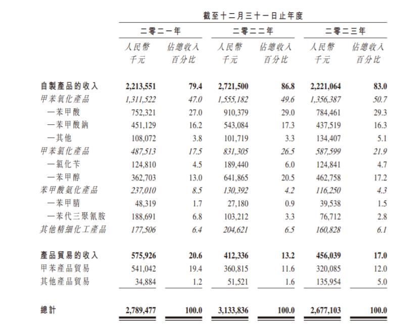 从营收构成来看,武汉的有机收入主要来自自制产品销售,包括甲苯氧化产品销售、甲苯氯化产品销售、苯甲酸氨化产品销售等。2021年、2022年和2023年,公司自制产品销售贡献的收入分别占总收入的79.4%、86.8%和83.0%。