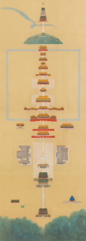 最终完成的作品以散点透视构建了北京中心线的完整画面,激活了中国古典界画最适合展示亭台楼阁的技艺。采用中国传统绘画制度、工具和材料,结合新材料和新技术,以现代美学实现全局,展现北京中心线宏伟的视觉场景。